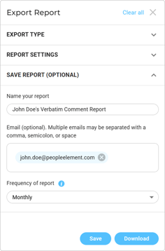 In this article we’ll cover how to download your comment analysis or verbatim comments, save & schedule your comment report, and make edits to your saved comment report.