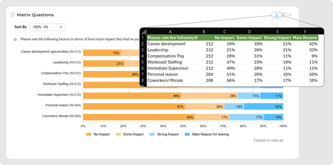 Users can now export Matrix and Engagement charts directly to Excel with a single click. Located in the top right corner of the chart is a download button. With one click an export will be downloaded directly to your browser.