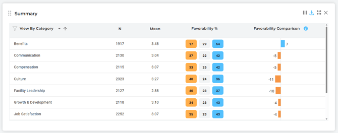 We enhanced the Summary Chart by introducing favorability breakouts, giving users a more complete view of their data through favorable, neutral, and unfavorable score distributions. This update allows teams to quickly identify not only areas of strength but also low-scoring items that may require attention.