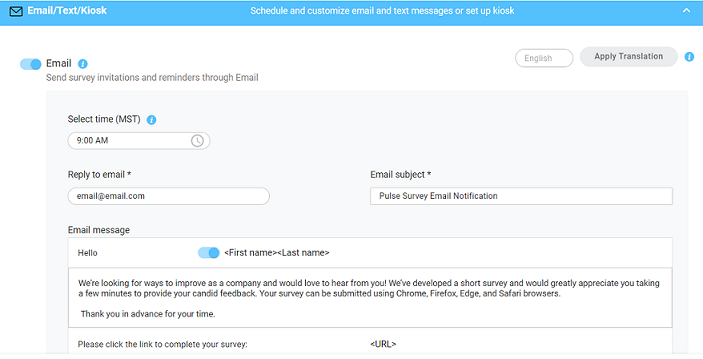 Select the method for survey distribution (if not anonymous) by toggling on email, SMS, and/or kiosk.