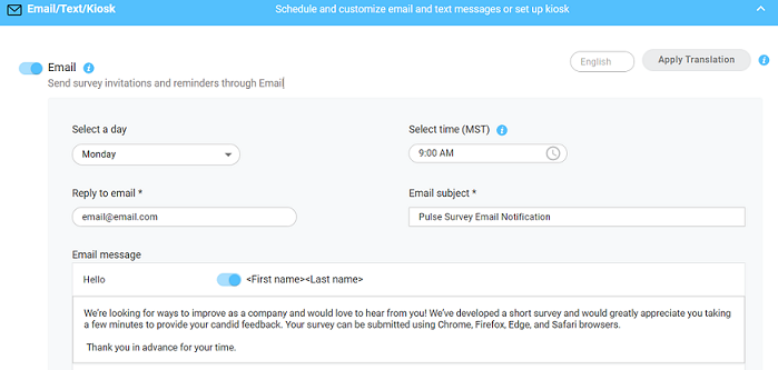 If your pulse survey is set to run weekly and you have enabled email or SMS, invitations will be sent on the day of the week you selected under send next pulse on. Anyone that has not yet completed their survey will receive a reminder two days later.