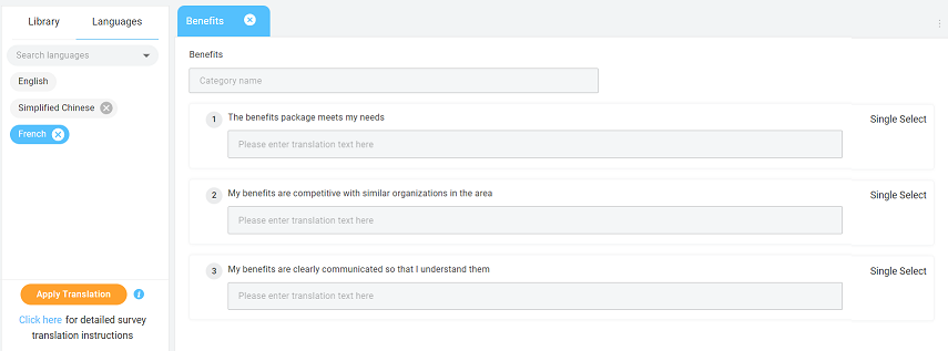 For full instructions on creating your survey, review our help article here. After setting up your survey in English, you can translate your survey into one of over 100 available languages.