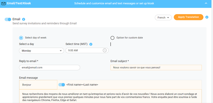 Send your survey invitations in the participants native language by translating the email/SMS messages. Create your messages in English then select a language from the dropdown menu and hit apply translation. If you do not choose to translate these messages, they will default to display in English.