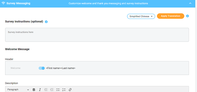 Your survey instructions, welcome message, and thank you message can all be translated into your survey languages. If you choose not to edit the welcome or thank you messages, our stock text will display.