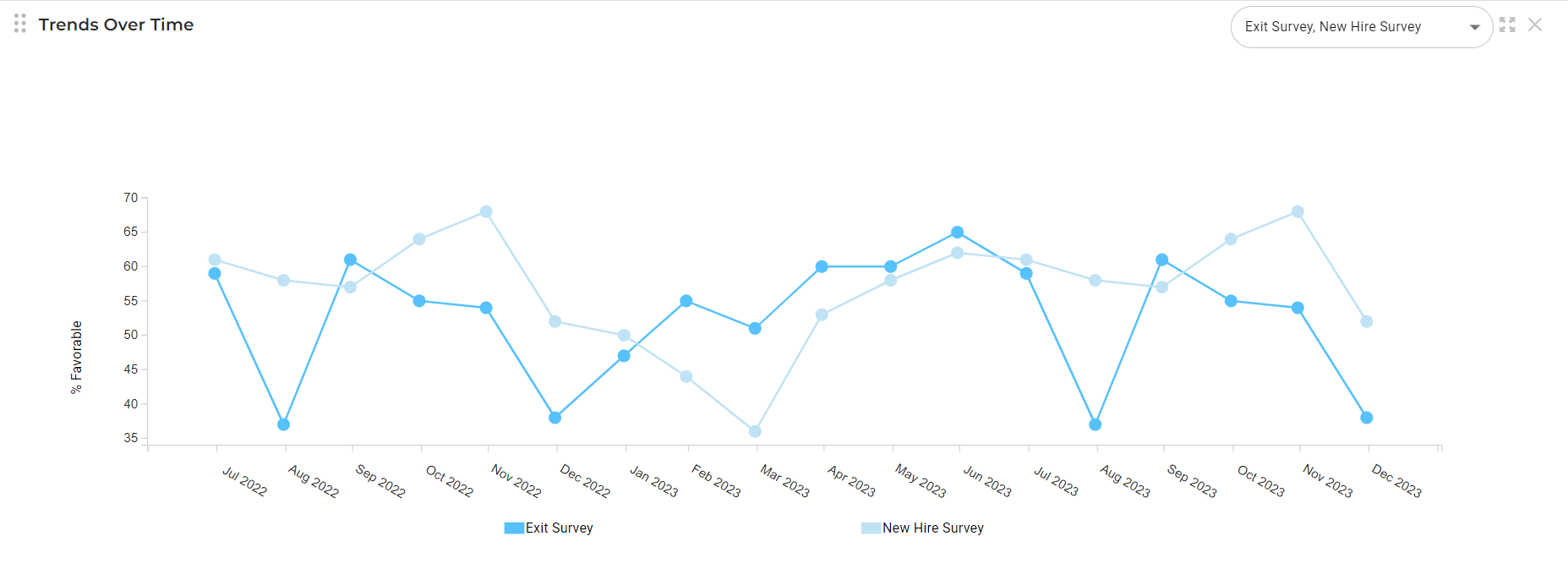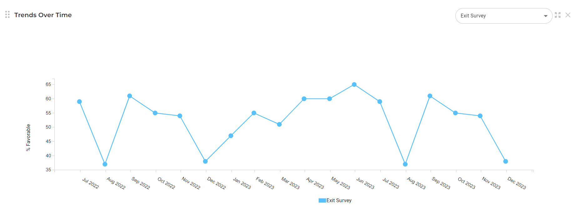Track your overall favorability score monthly with the Trends Over Time chart. Hover over the monthly data point to view that months favorability score and number of responses. You can view up to the last 18 months worth of data from the end date selected in your data filters for the selected survey(s).